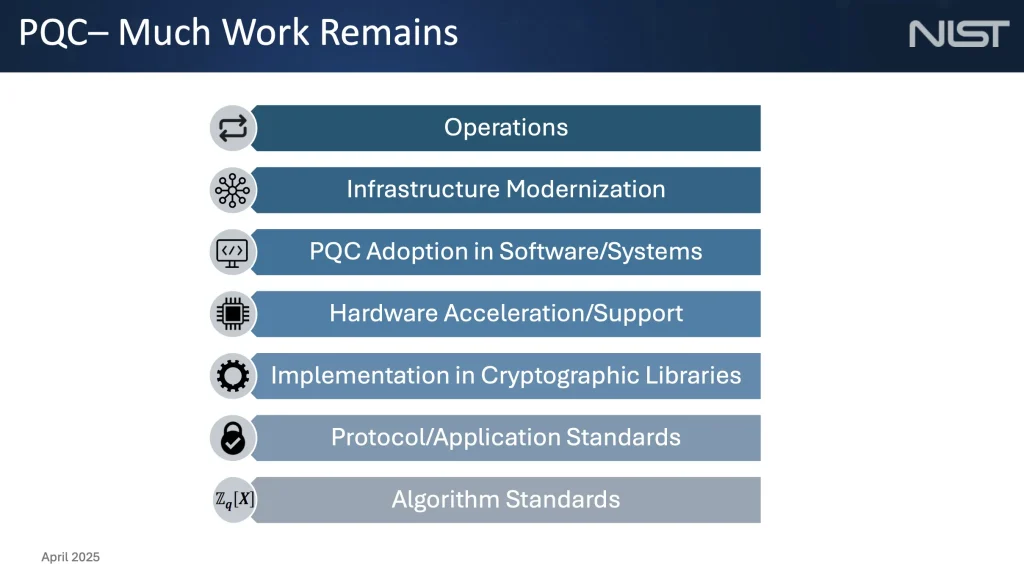 [1] Daniel Smith-Tone, “The End of the Beginning: NIST PQC Standardization Moving Forward,” National Institute of Standards and Technology, PQCrypto, April, 2025, https://pqcrypto2025.iis.sinica.edu.tw/slides/Invited1.pdf