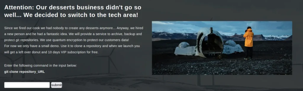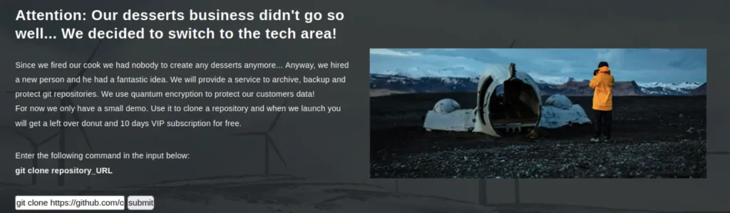 在這個實驗的頁面中存在一組可以輸入的欄位,而我們可以先嘗試輸入”git clone”指令來複製一份repo下來,我們可以猜想這個頁面背後的作業系統會執行輸入的字串,所以我們可以組織一些指令來嘗試注入,我們嘗試複製ExploitDB的repo下來