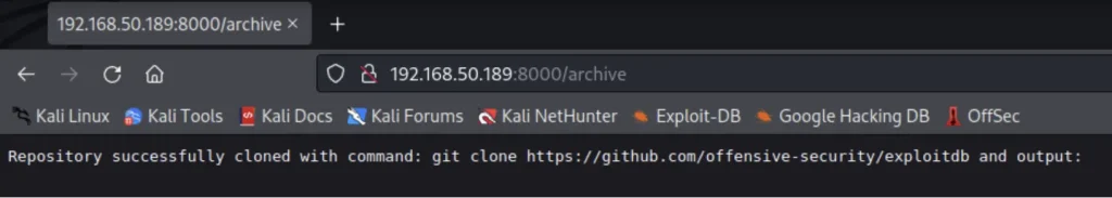 kali@kali:~$ curl -X POST --data 'Archive=git version' http://192.168.50.189:8000/archive