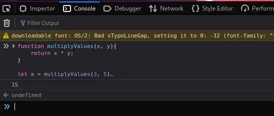 multiplyValues這個function可以吃兩個參數,並且把兩者相乘回傳給呼叫的地方,而範例中我們讓a呼叫了這個函式,最終會把結果賦值給a這個變數,目前這個a變數也沒有任何型態,畢竟JavaScript是個相對寬鬆的程式語言,所以只有當變數接收到任何參數時當下才決定該變數型態