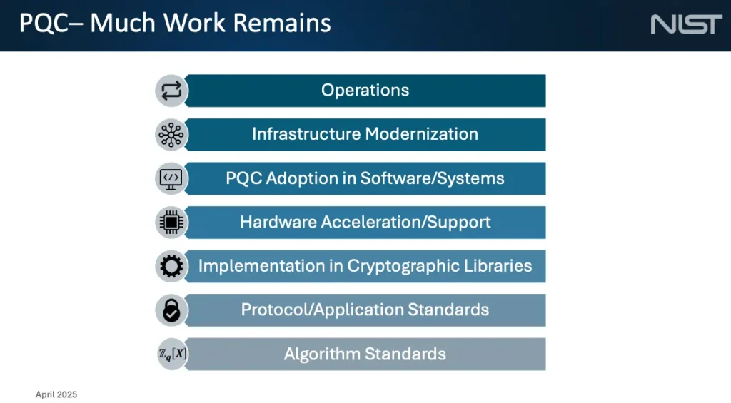 [1] Daniel Smith-Tone, “The End of the Beginning: NIST PQC Standardization Moving Forward,” National Institute of Standards and Technology, PQCrypto, April, 2025, https://pqcrypto2025.iis.sinica.edu.tw/slides/Invited1.pdf