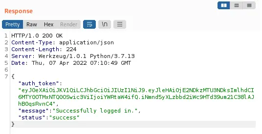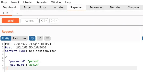 kali@kali:~$ curl -d '{"password":"pwned","username":"admin"}' -H 'Content-Type: application/json' http://192.168.50.16:5002/users/v1/login