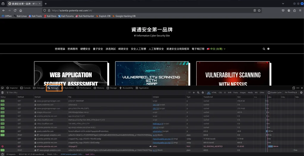 現今存在數種技巧可以直接從瀏覽器取得相關的資訊,現代瀏覽器裡的開發者工具可以協助我們進行枚舉,雖說開發者工具如其名應該是給網頁開發者使用的,但也很適合給我們在做滲透測試時取得目標服務的一些資訊,實驗利用Firefox作為目標,畢竟在許多Linux裡這是預設的瀏覽器,但其他種的瀏覽器操作也大同小異