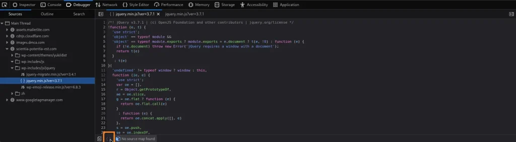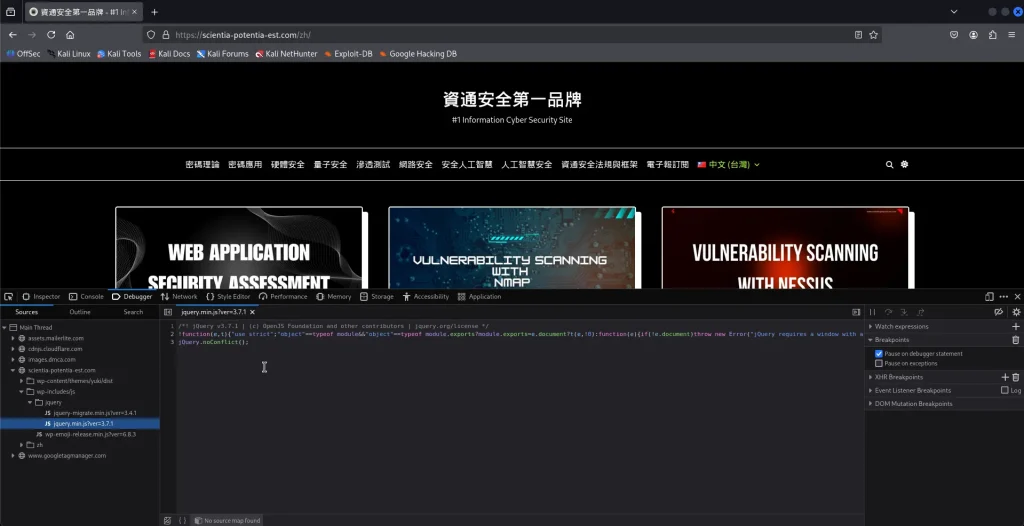 在Debugger頁面底下我們看到這個網頁服務使用jQuery版本3.7.1的套件,這是一項常見的JavaScript函式庫,我們注意到這個檔案叫做”jquery.min.js”,意思是開發者將這個函式庫極簡化了,為的是讓程式碼所需耗費的檔案大小降低,所以會把換行通通拿掉讓code擠在一起