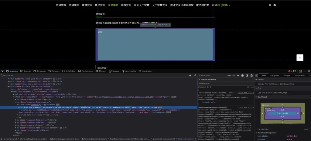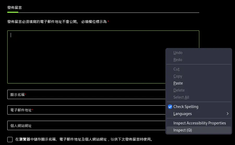 另外在Inspector我們可以更加深入的探討網頁的內容,我們在某一篇文章底下的留言區找到任一個輸入的欄位,右鍵選取Inspect